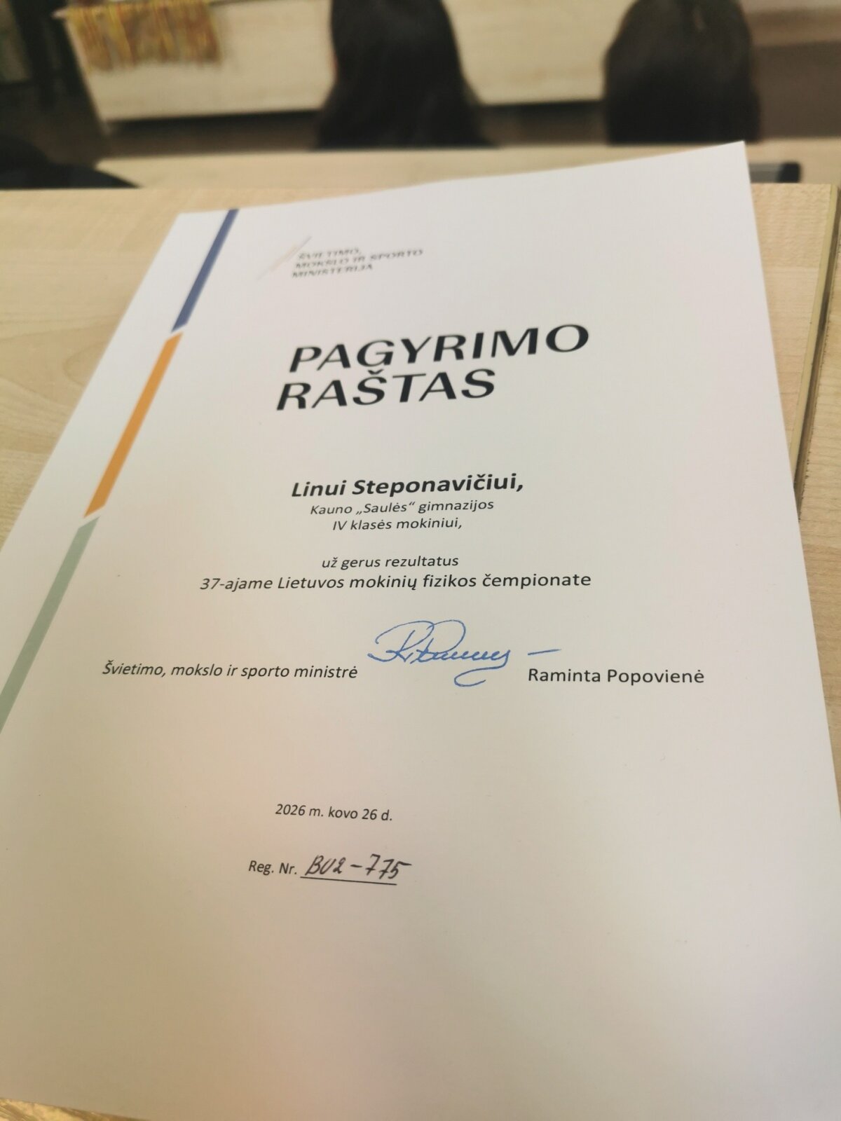 Kovo 26-28 d. 4B klasės mokinys Linas Steponavičius dalyvavo 73-osios Lietuvos mokinių fizikos olimpiados šalies etape. Šiais metais olimpiada vyko Kauno technologijos universiteto Matematikos ir gamtos mokslų fakultete. Dvi dienas moksleiviai intensyviai dirbo atlikdami teorines ir praktines užduotis. Paskutinę dieną buvo išdalinti Respublikinio fizikos čempionato ir Respublikinės fizikos olimpiados apdovanojimai. Sveikinimai Linui Steponavičiui (mokytoja V. Povilaitytė), gavusiam 37-ojo Fizikos čempionato padėkos raštą už gerus rezultatus.
