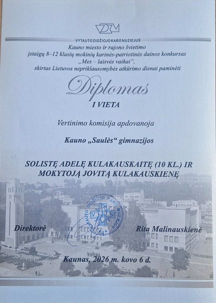 SOLISTŲ KATEGORIJOJE 1-ąją vieta pelnė Kauno „Saulės“ gimnazijos solistė Adelė Kulakauskaitė ir mokytoja Jovita Kulakauskienė.