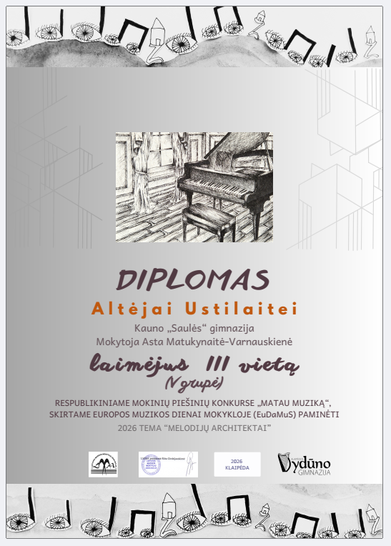 Sveikiname Altėją Ustilaitę, (1C) ir ją ruošusią mokytoją Astą Matukynaitę-Varnauskienę, dalyvavusias Klaipėdos Vydūno gimnazijos organizuotame respublikiniame mokinių piešinių konkurse „Matau muziką“, skirtame Europos muzikos dienai mokykloje (EuDaMuS) paminėti. Konkursui autorė sukūrė miniatiūrą tema „Popietės svajonė“ ir I-IV gimnazinių klasių grupėje laimėjo III vietos diplomą. Kviečiame pasigrožėti autorės kūryba.
