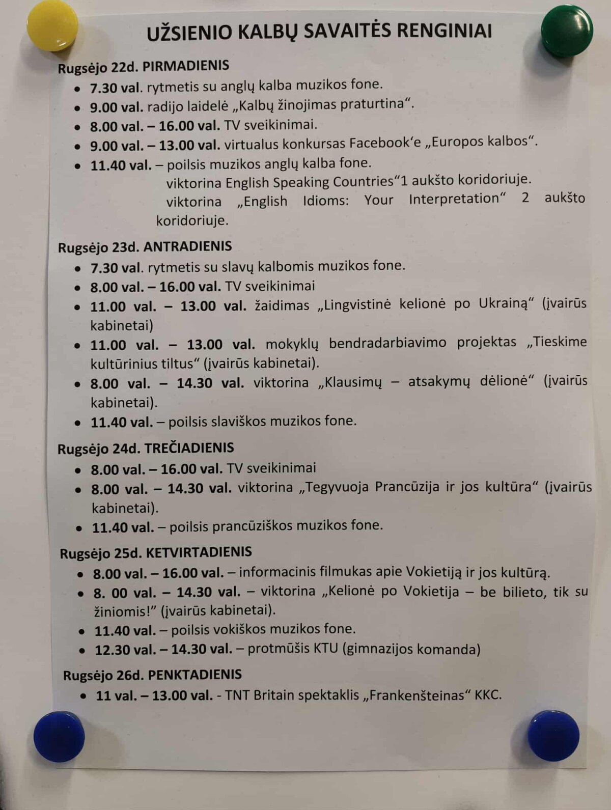 Rugsėjo 22 - 26 dienomis Kauno „Saulės“ gimnazija ne tik paminėjo Europos kalbų dieną, bet ir visą savaitę skyrė užsienio kalbų populiarinimui. Pirmadienis buvo skirtas anglų kalbai, antradienis - slavų kalboms, trečiadienis - prancūzų, o ketvirtadienis - vokiečių kalbai. Rytais gimnazistus pasitiko dainos įvairiomis kalbomis, kurios netilo ir ilgosios pertraukos metu. Be to, mokiniai turėjo galimybę išmokti pasisveikinti skirtingomis Europos kalbomis, sudalyvauti kalbų konkursuose, viktorinose, konferencijoje, protmūšyje ir laimėti prizų.