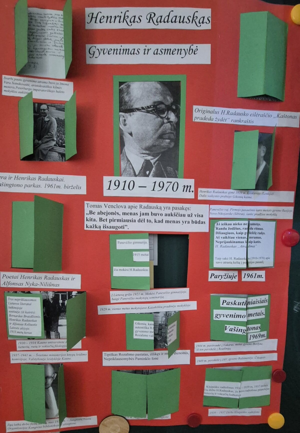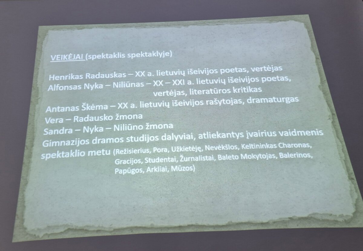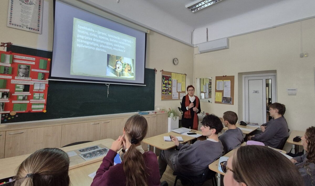 Lapkričio 27 d. ir 28 d. 2K ir 3E klasėse vyko integruota lietuvių kalbos ir literatūros bei teatro pamoka tema „Pasauliu netikiu, o Pasaka tikiu“, kurią vedė L. Laucevičienė ir A. Kondrotienė. Muzika, dekoracijos, paveikslai, veikėjų dialogai, spektaklio siužetas padėjo gimnazistams geriau pažinti H. Radausko asmenybę bei suprasti poeto poeziją. Tomas Venclova yra pasakęs: „Be abejonės, menas jam buvo aukščiau už visa kita. Bet pirmiausia dėl to, kad menas yra būdas kažką išsaugoti.“