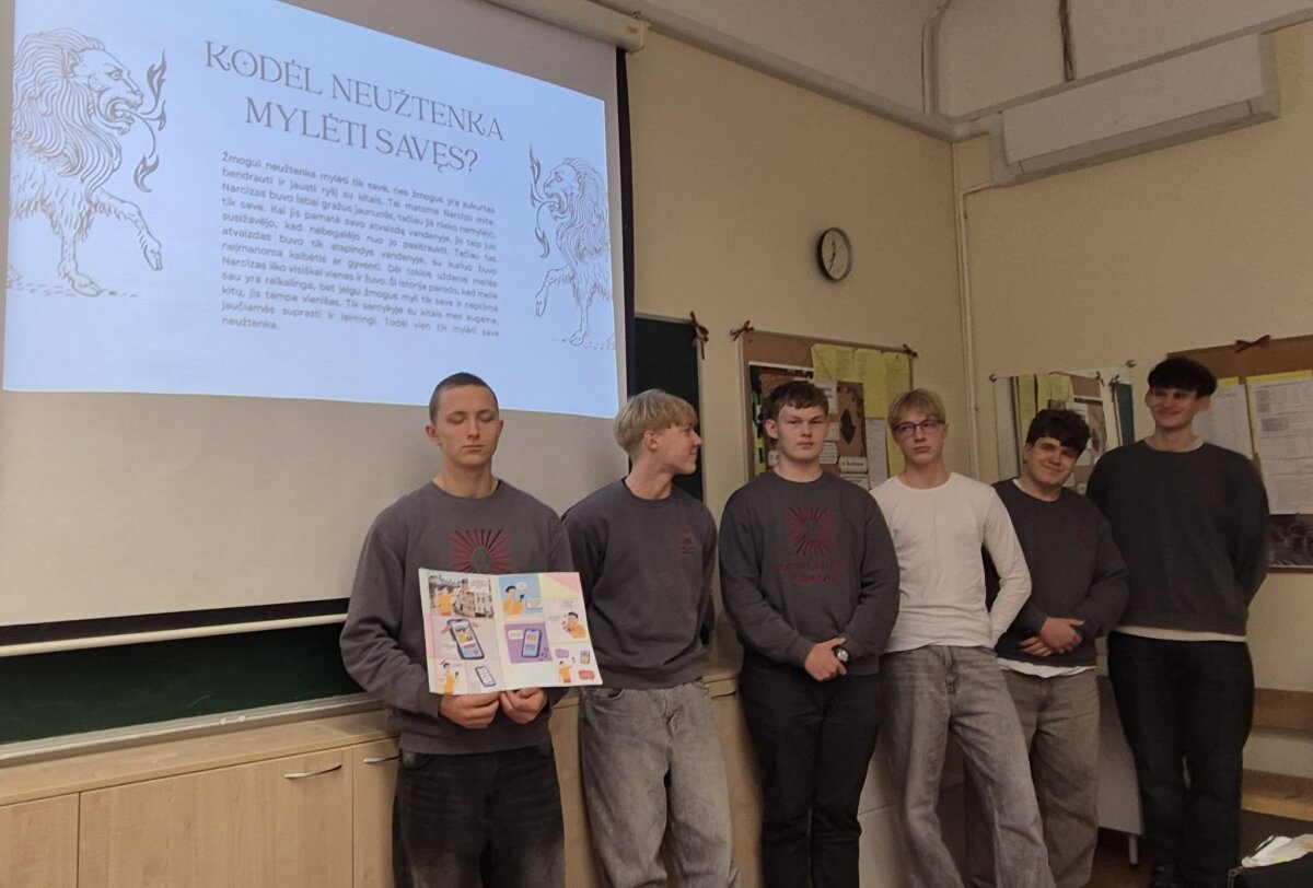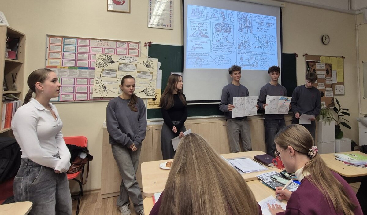 Įgyvendinant #TŪM Kultūrinio ugdymo veiklą 39.5 „Vizualinio mąstymo strategijos taikymas pamokose“ šių metų lapkričio 17 d. 2K klasės mokiniams vyko integruota lietuvių kalbos pamoka, kurią vedė lietuvių kalbos mokytoja ekspertė Audronė Kondrotienė. Pamoką stebėjo MO muziejaus edukatorė Karilė Mozerytė. Pamokos tema „Homero „Odisėjos“ veikėjai - visais laikais aktualūs simboliai“. Mokiniai remdamiesi aptartais graikų mitais, jų interpretacijomis, sava patirtimi ir pasirinkę svarbią gyvenimo aktualiją kūrė mitinius komiksus, kuriuos pristatė pamokoje. Vėliau pildė duotą lentelę, kurioje turėjo nurodyti simbolį, pateikti jo paaiškinimą, priskirti jam tinkamą citatą, nurodyti galimas sąsajas su skaitytų kūrinių personažais, parašyti trumpą pagrindimą, kodėl atitinkamą simbolį sieja su tuo personažu. Stebėdami pateiktus paveikslus iš MO kolekcijos aptarė veikėjų kūrimo principus bei savo įžvalgas siejo su poemos personažais.