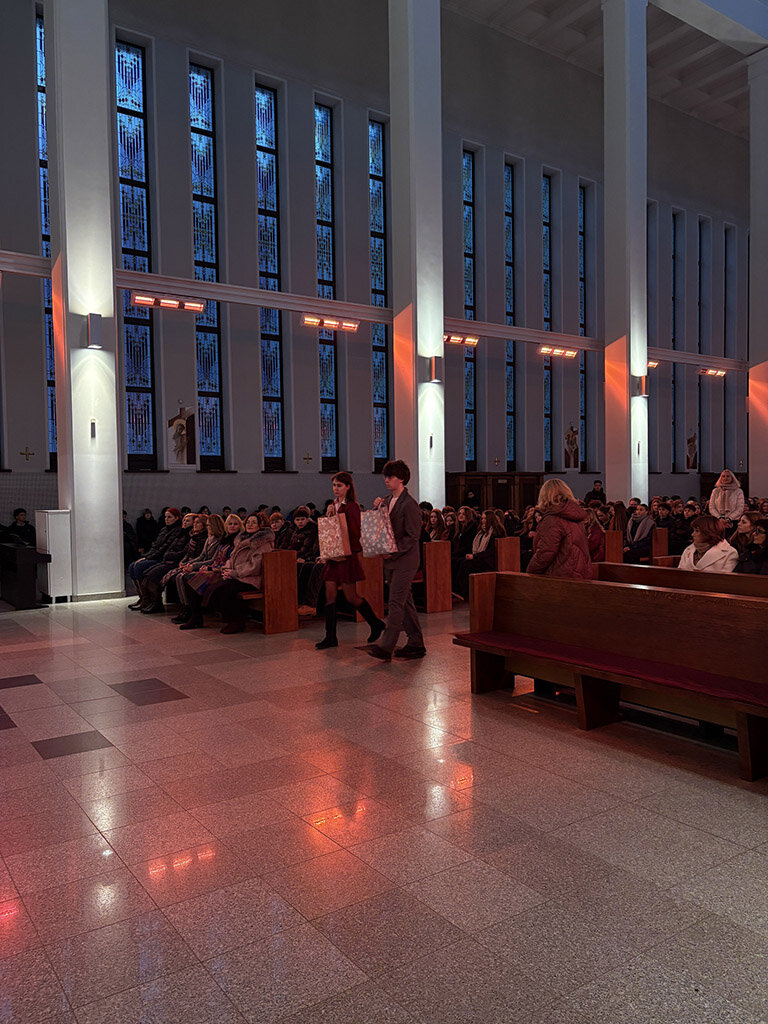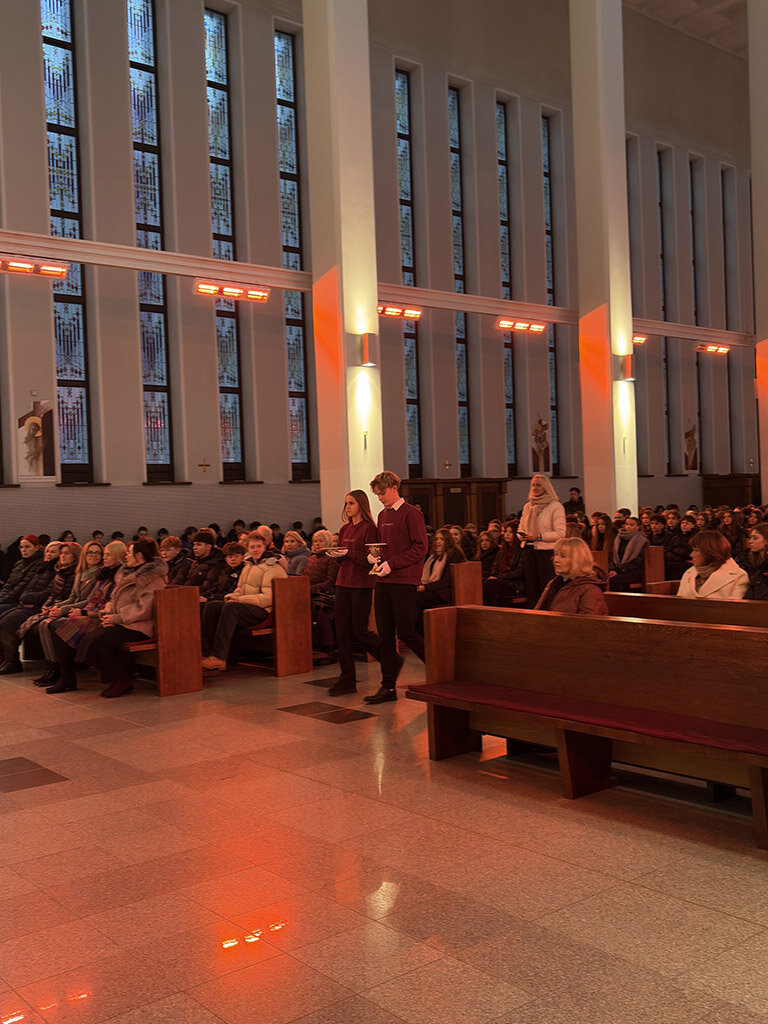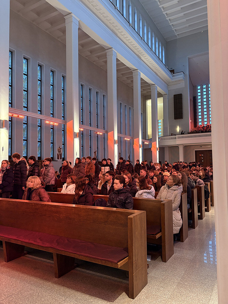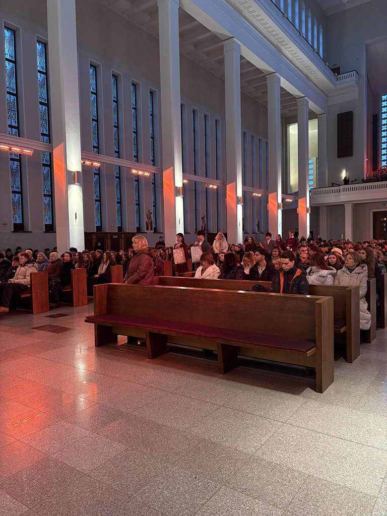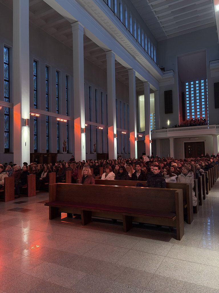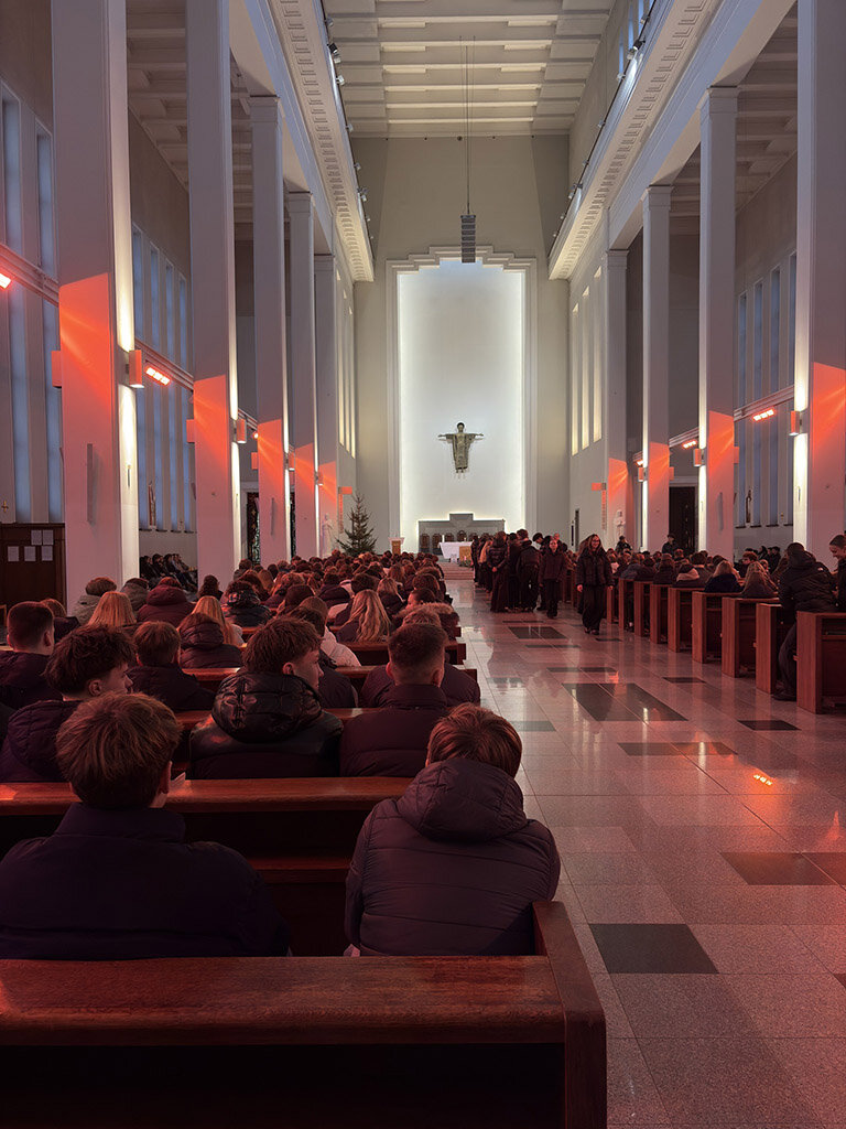 Advento rekolekcijose Kristaus Prisikėlimo bazilikoje gimnazijos bendruomenė įsiklausė į parapijos klebono kun. teol. lic. Kęstučio Rugevičiaus kvietimą susitikti su Kristumi širdies tyloje, džiugioje bendrystėje ir giesmių tekstuose.