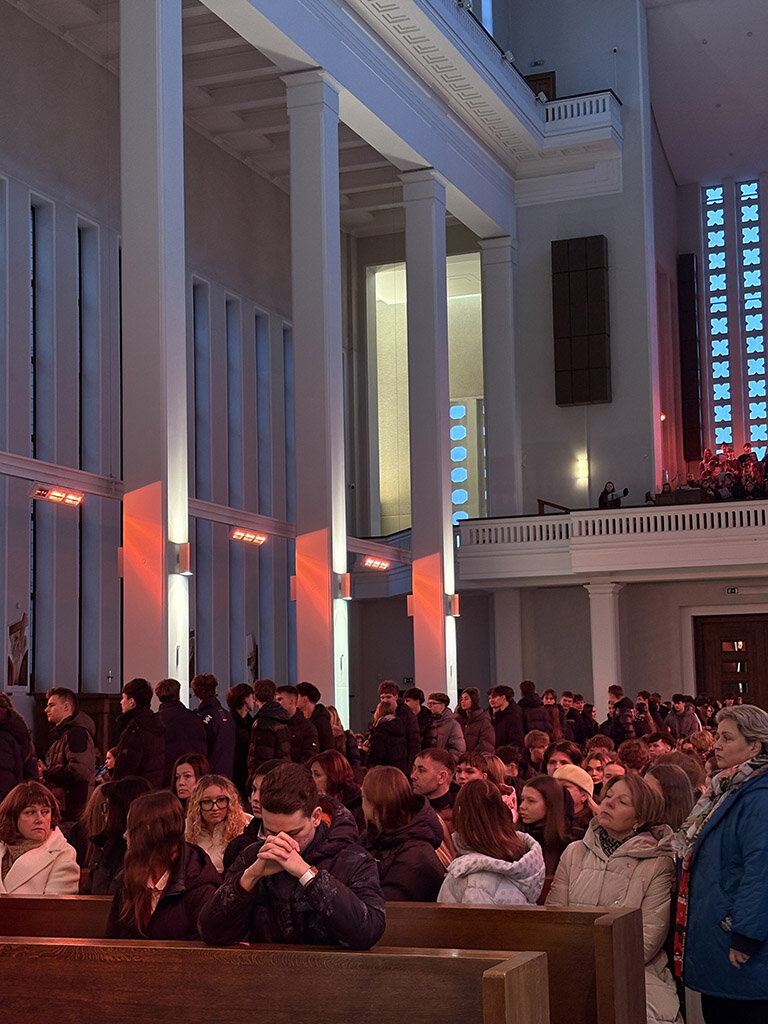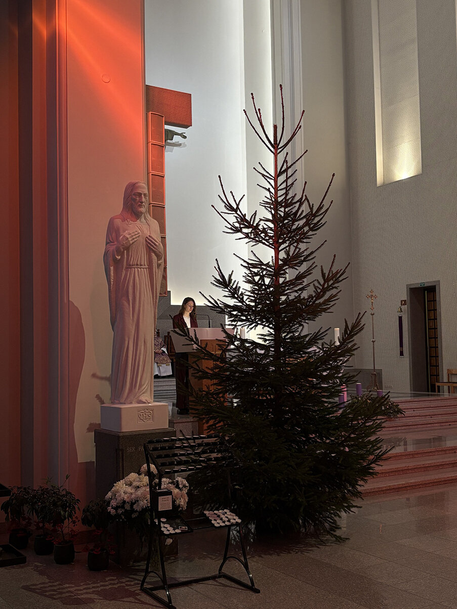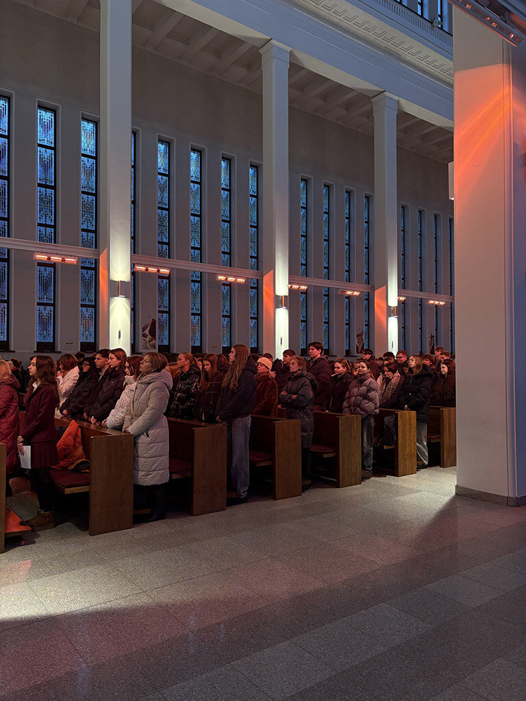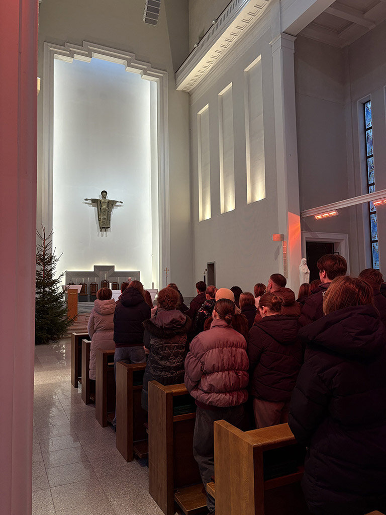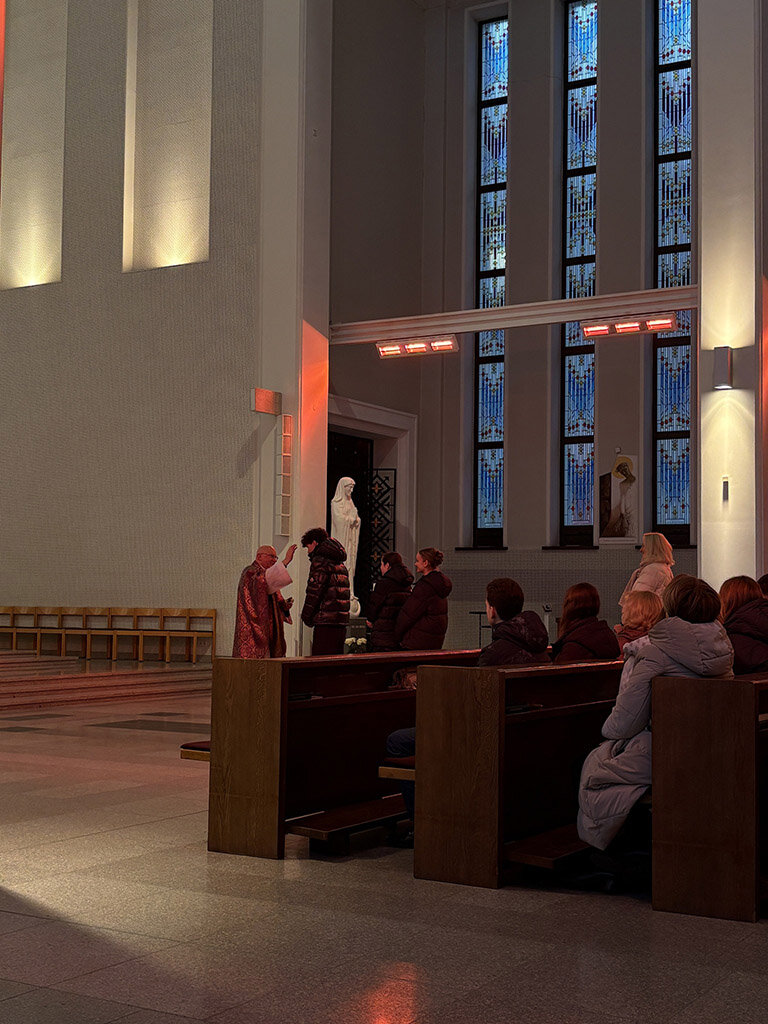 Advento rekolekcijose Kristaus Prisikėlimo bazilikoje gimnazijos bendruomenė įsiklausė į parapijos klebono kun. teol. lic. Kęstučio Rugevičiaus kvietimą susitikti su Kristumi širdies tyloje, džiugioje bendrystėje ir giesmių tekstuose.