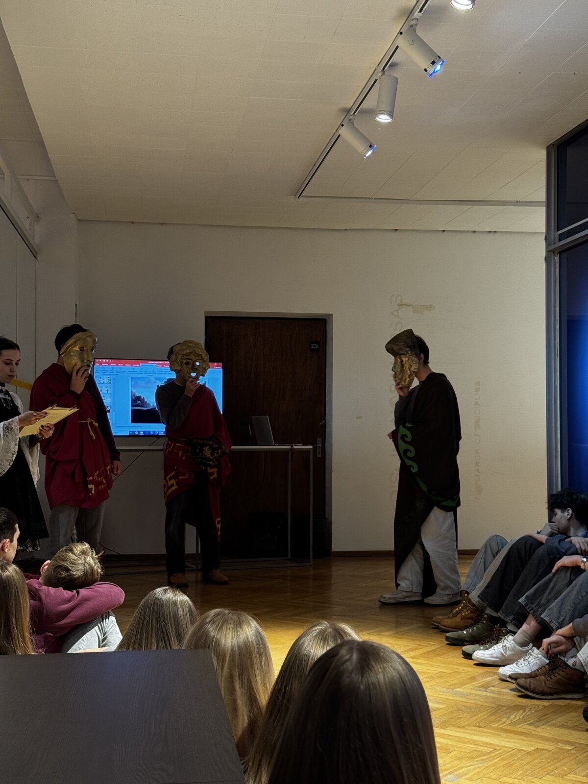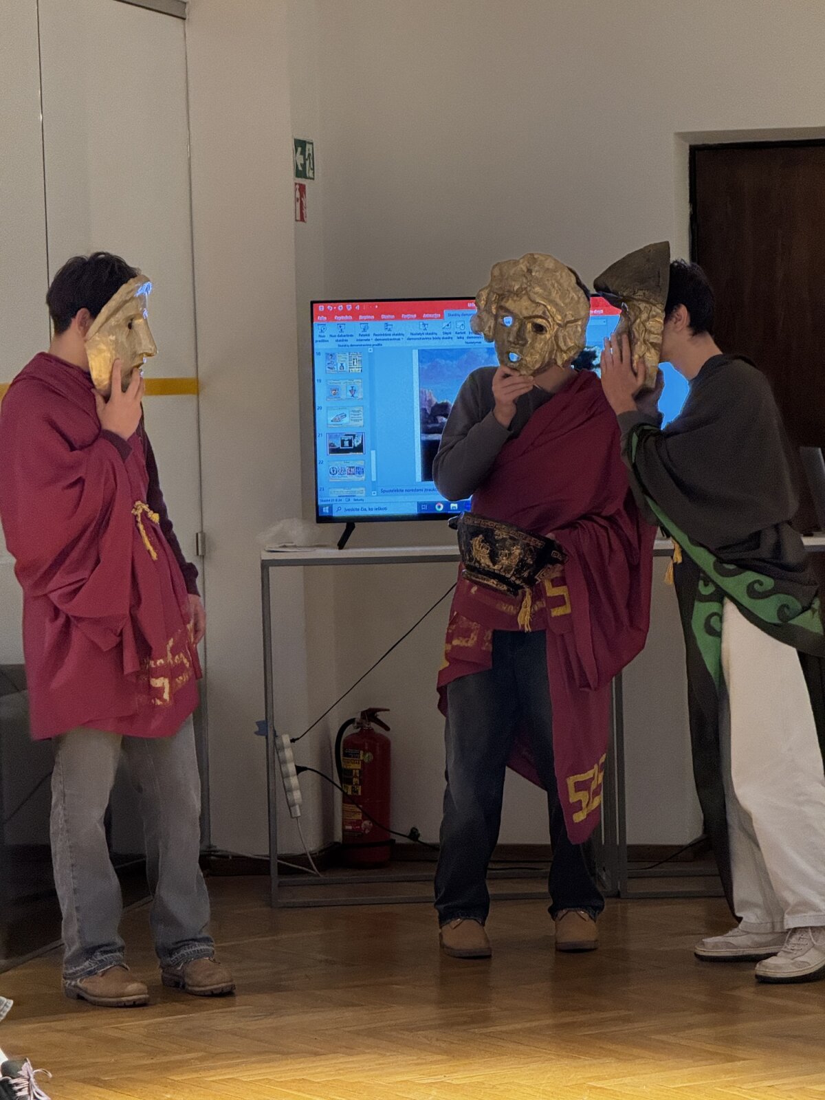 Pirmasis užsiėmimas vyko Kauno Paveikslų galerijoje, kur dalyvaudami integruotoje pamokoje „Linksmybės pagal graikus“, mokiniai susipažino su antikinės Graikijos istorija, dievais ir keramika. Praktinės veiklos buvo ypač smagios, nes vaikai rengėsi chitonus, vaidino ir mokėsi šokti sirtakį. Drauge su mokiniais Antikos kultūros paslaptis tyrinėjo ir mokytoja Ieva Drazdavičiūtė.