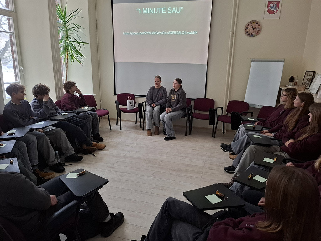 Gimnazijos projekto „Mokinys - Mokiniui“ veiklos įsibėgėjo jau pirmąją sausio savaitę. 2H klasės gimnazistės Lėja Jurkevičiūtė ir Augustė Sinkevičiūtė vedė etikos pamoką tema „Ramybė“. Jaunosios mokytojos, bendraudamos su 1A, 1C, 1D, 1E, 1F, 1G klasių mokiniais, turėjo galimybę pasidalinti savo atradimais, patyrimais bei įžvalgomis, kodėl šiuolaikiniame pasaulyje yra taip svarbu ne tik ieškoti, bet ir rasti kiekvienam žmogui kelius į vidinę ramybę, vedančią harmonijos link. Aptarė, kas padeda pasiekti ramybę, paskatino kiekvieną pirmoką perfiltruoti savo mintis ir pačiam rasti geriausius kelius į asmeninę vidinę ramybę siekiant ne tik asmeninės gerovės, bet ir visuomenės tobulėjimo. Nuoširdus ačiū merginoms už sukurtą galimybę jauniesiems kolegoms tuos pačius dalykus matyti kitaip. Juk „ramybė prasideda šypsenoje“, - teigė Motina Teresė.