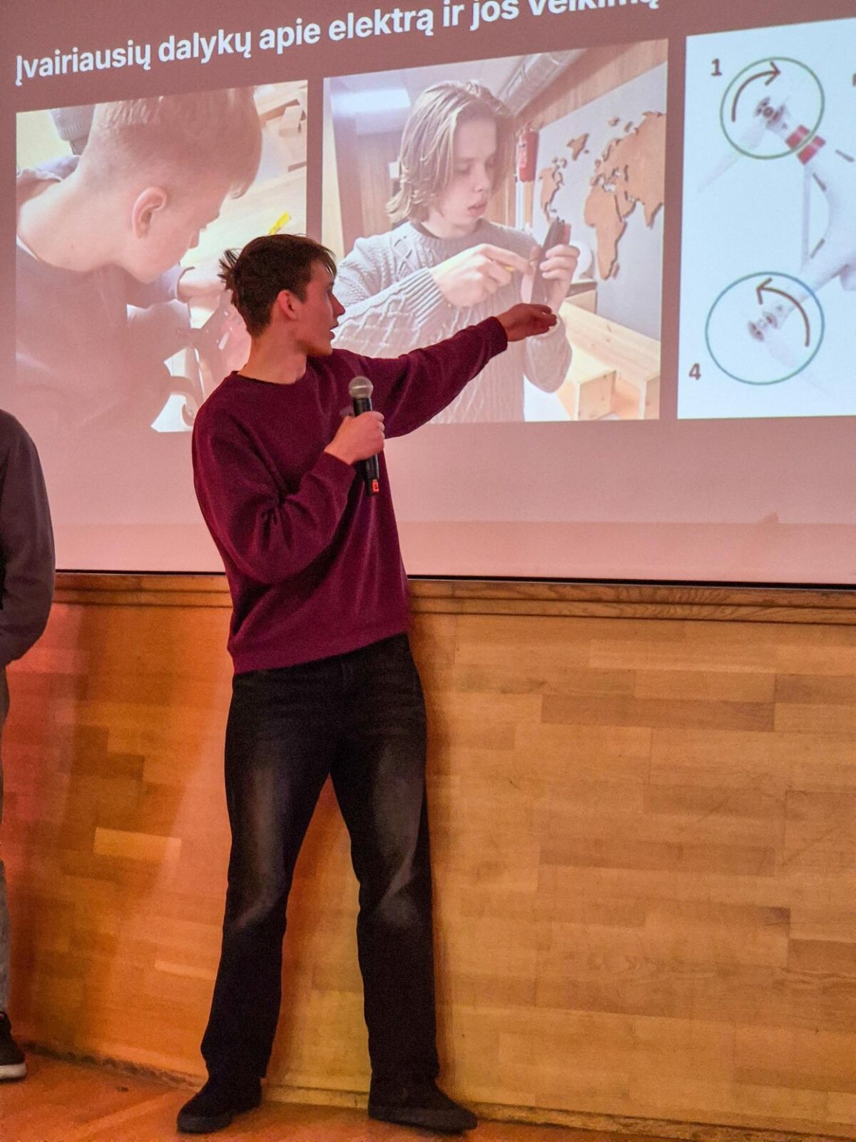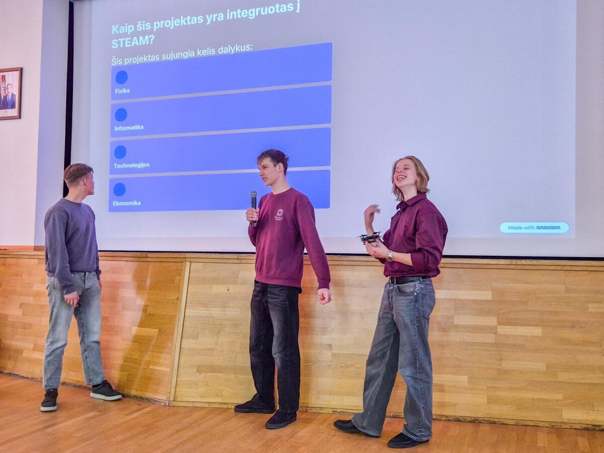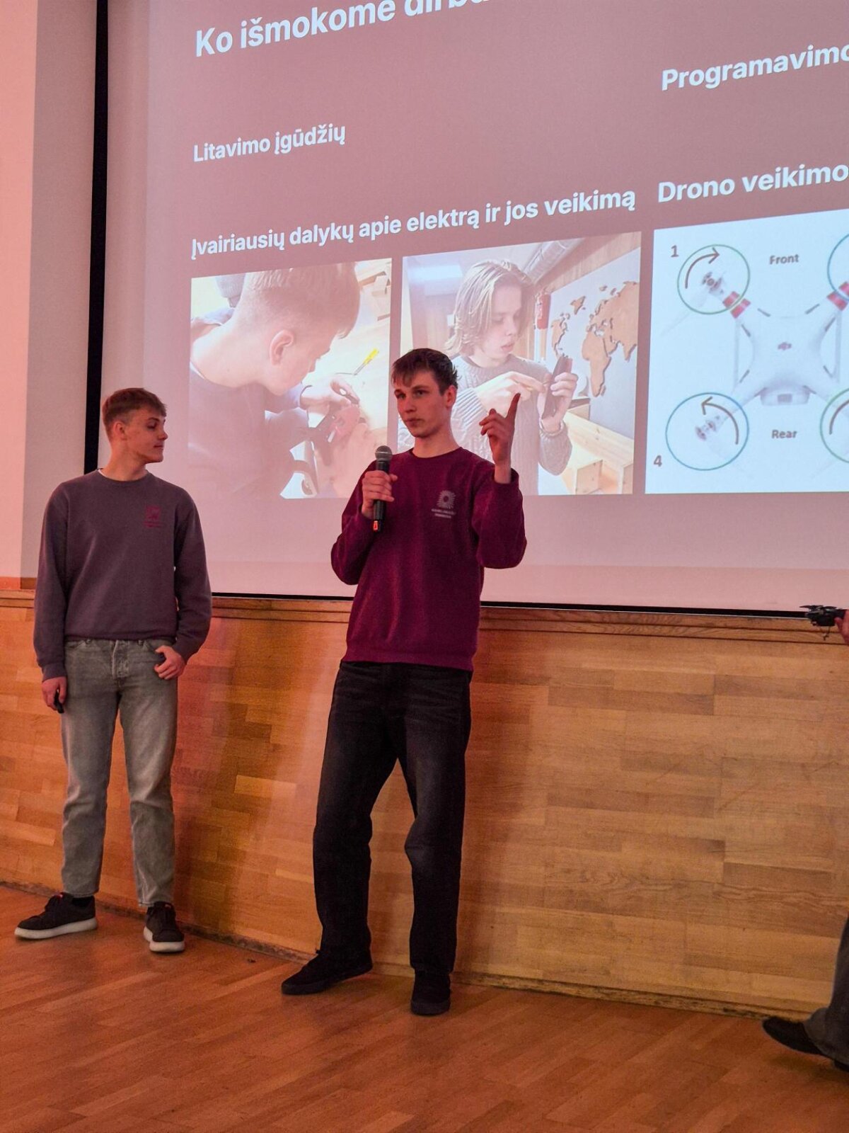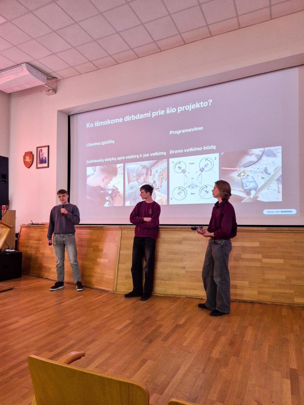 Vilius Urbonavičius, Vytis Kilinskas ir Mykolas Starevičius (2F) konferencijos dalyviams pristatė savo sukurtą droną. Vaikinai atskleidė tikrąją kūrybos užkulisių pusę: kaip praktiškai pritaikė fizikos, IT, technologijų ir matematikos žinias, kodėl klaidos yra vertingesnės už greitą sėkmę (būtent jos atvedė prie svarbiausių atradimų), kaip mokymasis tampa prasmingas, kai sprendi realias problemas.