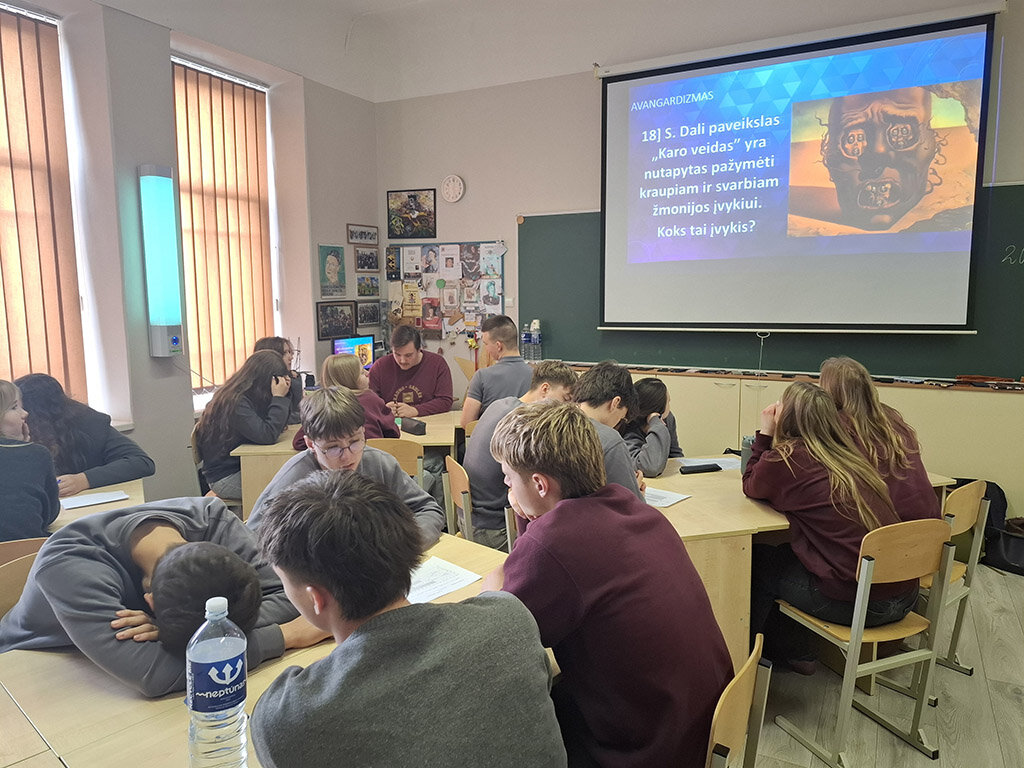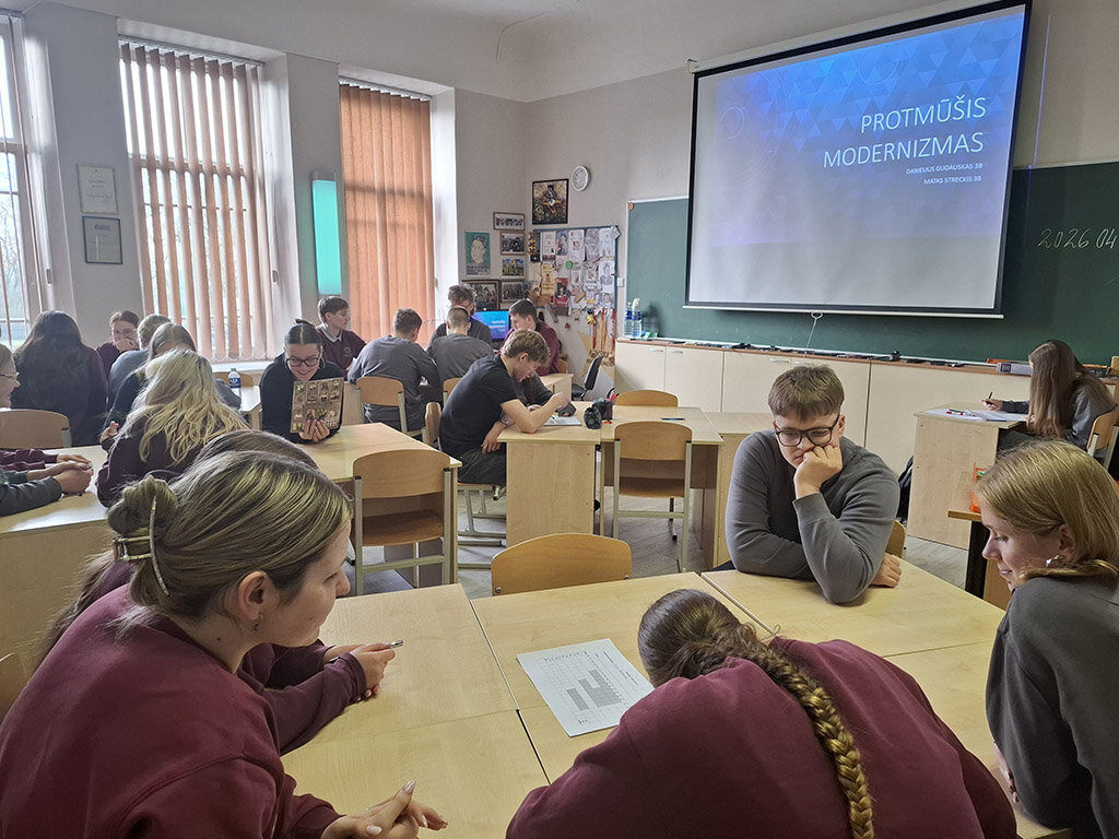 Nustebsite – dvidešimt. Kaip atsakyti į šį ir kitus įdomius klausimus: „Kurio M.K. Čiurlionio paveikslo reprodukcija puošia mūsų gimnaziją?“, „Ką reiškia literatūros ir meno žurnalo MUBA pavadinimas?“, „Kaip tarpukariu buvo vadinamas Kaunas dėl modernios architektūros ir išlavinto damų stiliaus?“, galvą suko po atostogų grįžę 3AB klasės mokiniai per netradicinę lietuvių kalbos pamoką – protmūšį „Modernizmas“. Pamoką vedė lietuvių kalbos mokytoja A.Marčiulionienė. Protmūšį sukūrė alumnai Matas Streckis ir Danielius Gudauskas, kai buvo trečiokai (projektas „Mokinys – mokiniui“). Žaidimo tikslas įtvirtinti žinias apie modernizmą ir įgyti naujų, geriau suprasti modernios literatūros, kurią jau ketvirtą mėnesį skaito, analizuoja ir interpretuoja, kontekstą.